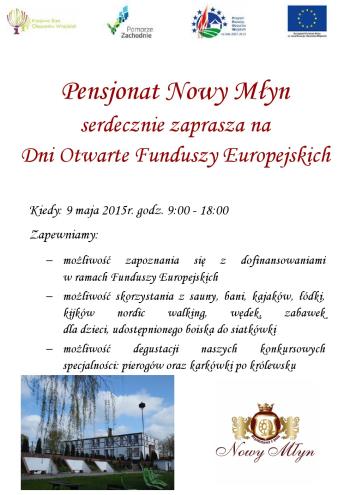 Pensjonat Nowy Młyn zaprasza na Dni Otwarte Funduszy Europejskich. Już 9 maja każdy będzie miał możliwość zapoznania się z dofinansowaniami w ramach Funduszy Europejskich. Ponadto Pensjonat w tych dniach zapewnia m.in. dostęp do bani, sauny i kajaków. Zapraszamy!